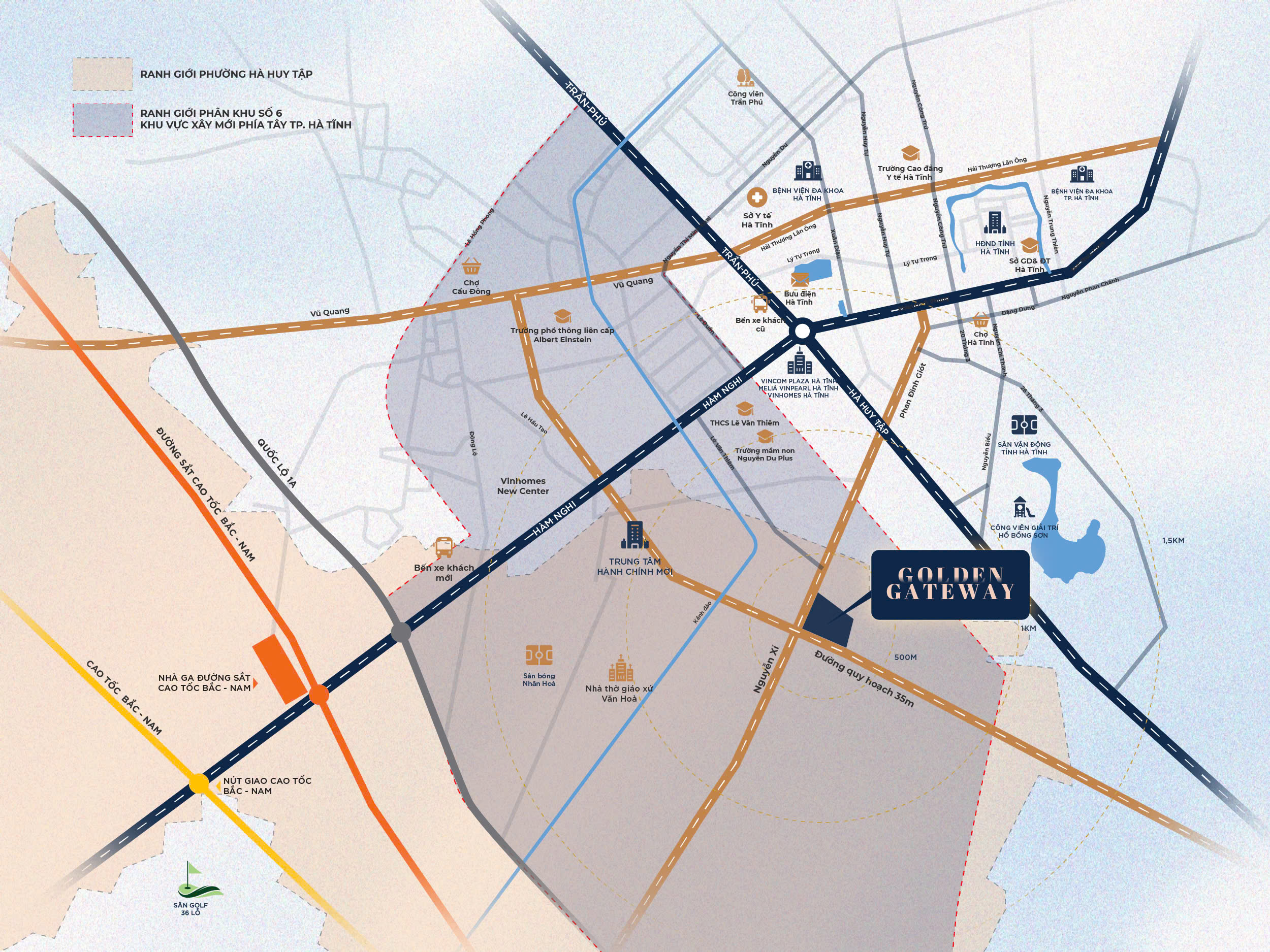 Khu đô thị Golden Gateway tọa lạc tại phường Hà Huy Tập, thuộc vùng quy hoạch số 6 của tỉnh Hà Tĩnh, khu vực được xác định là không gian phát triển đô thị mở rộng, ưu tiên đầu tư hạ tầng và kết nối trong chiến lược phát triển giai đoạn mới. Theo định hướng quy hoạch, vùng này đóng vai trò quan trọng trong việc giãn dân, hình thành các khu đô thị hiện đại, đồng bộ chức năng ở – dịch vụ – thương mại, qua đó tạo nền tảng cho gia tăng giá trị bất động sản và nâng tầm diện mạo đô thị trung tâm Hà Tĩnh trong dài hạn.
